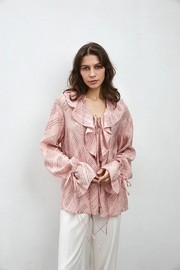 Блуза с пышными рукавами и складками на талии, в розовую клетку белый